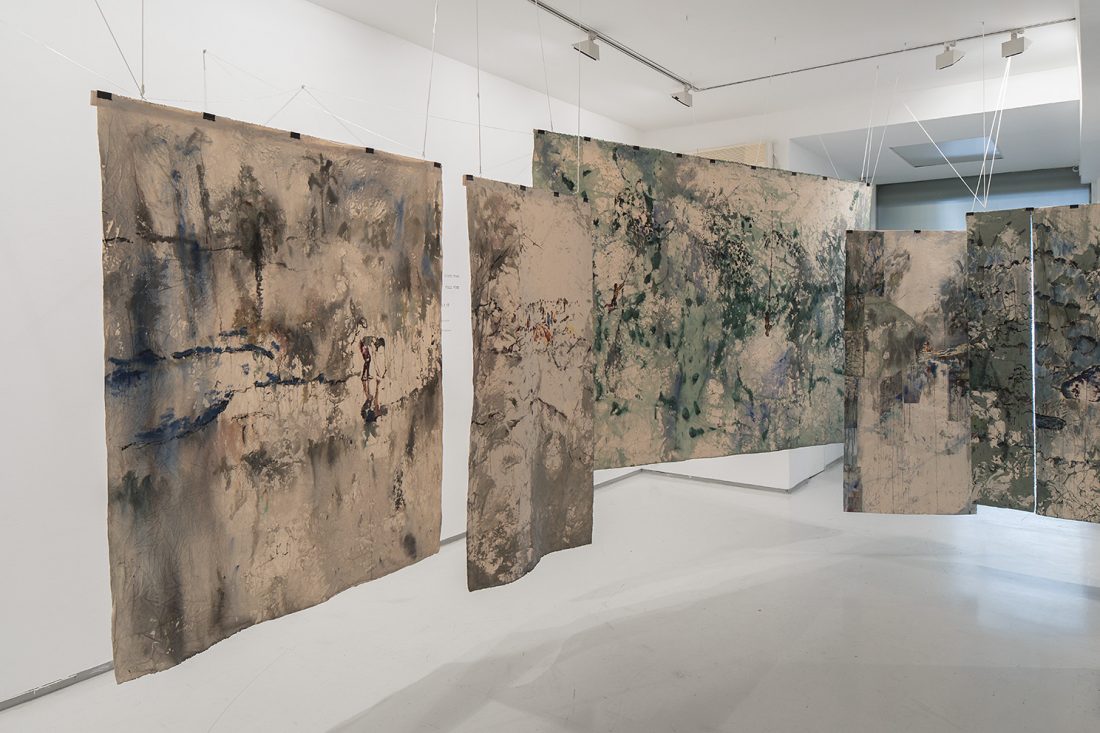 The installation stresses the paintings’ unified continuity. They hang from the ceiling, while creating an inner, circular structure in the middle of the gallery – a makeshift construction into which the viewer is welcomed to enter. There, surrounded by the large canvases, the viewer might find what he wished for – a balance, a focal point. This constellation is reminiscent of Edmund Husserl’s phenomenological definition of the horizon. Husserl distinguishes between an “internal horizon” and an “external horizon”. The first includes the visible aspects of a given object – in this case, the inner sides of the canvases – the carriers of the image. The latter refers to the invisible aspects of the object – the outer sides of the canvases.